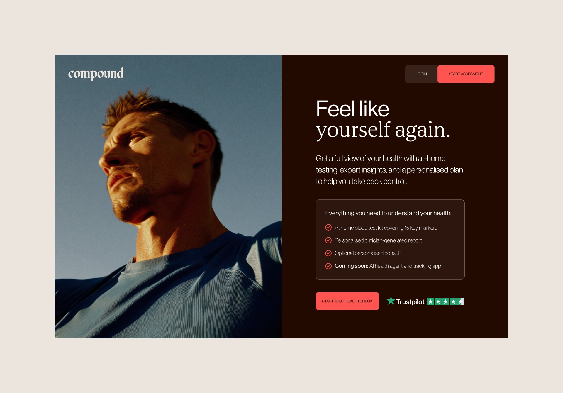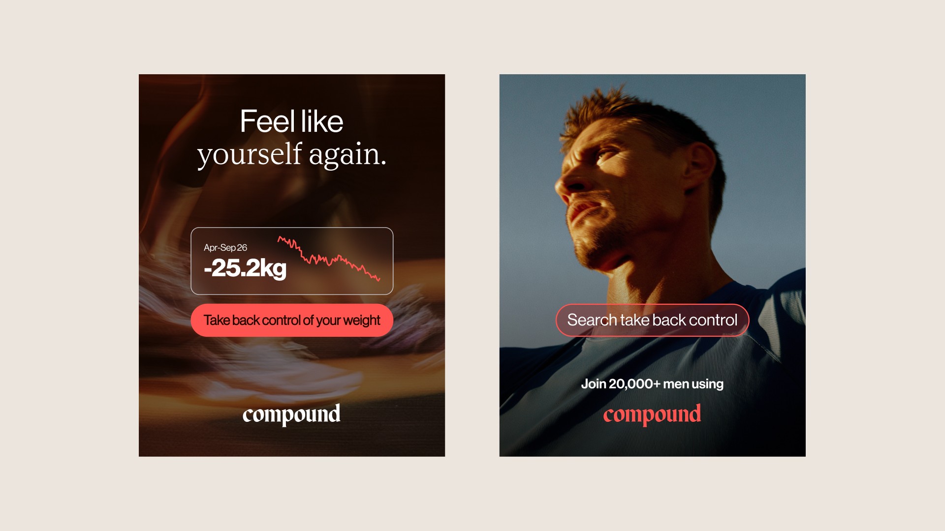 Compound is a UK based health and wellness company delivering personalised, medically informed body transformation programmes for men. By combining tailored nutrition, structured training and clinical support, it helps members achieve sustainable fat loss and long term health improvements. My brief was to conceptualise and develop a growth led brand campaign designed to drive sign ups across paid media and the full website journey. I also defined a clear art direction for photography, creating AI generated imagery in Midjourney that balanced a premium, male positive, action driven aesthetic with Compound’s refined editorial tone across a wide range of digital assets.
